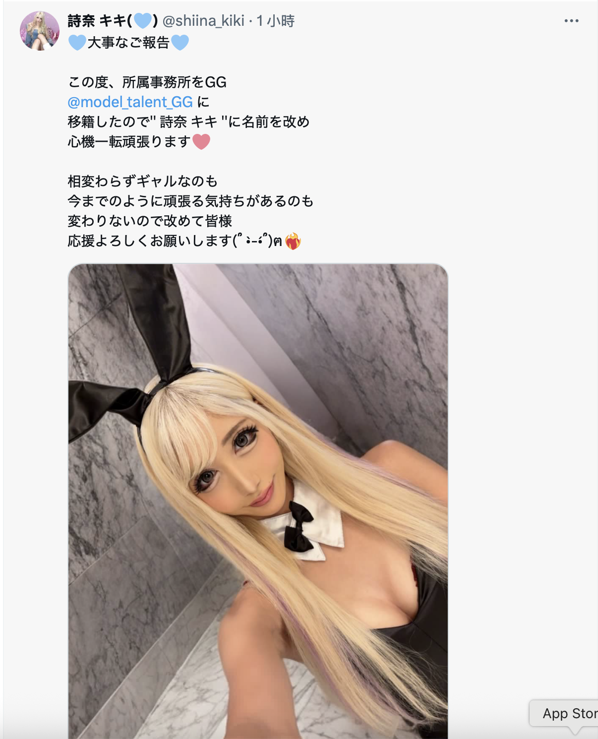 雖然藝名變了,不過她並沒有提到要更換社群帳號(https://x.com/shiina_kiki),所以應該是修一下ID繼續用吧?然後她說自己仍然還是個辣妹,努力的心情也沒有變,所以想再次拜託大家繼續支持她,多多指教〜