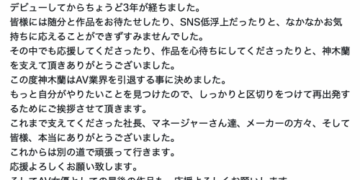 為什麼呢?神木蘭說是因為找到了是因為找到了更想做的事情,所以決定把AV女優的生涯畫上句點,重新出發,於是在社群上告訴大家自己的決定ー未來她會再另外一條道路上繼續努力,也希望大家為她加油;最後,作為AV女優的最後一支作品,也請每一位粉絲多多指教~
