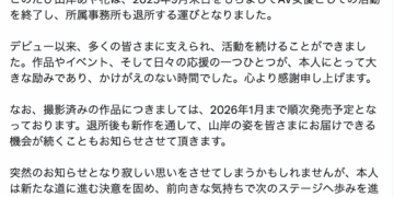 也就是說她不做AV女優了。已經拍好的作品還是會陸續發行,在2026年1月都可以在淫光幕前看到山岸的身影;同時,經紀公司也說,雖然消息來得突然,但因為本人已經下定決定邁向下一個舞台,所以希望大家能支持她的決定〜