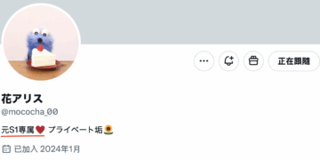 儘管是這是プライベート垢(私人帳號),不過這(https://x.com/mococha_00)是花アリス(花愛麗絲)現在主要使用的帳號,不過重點不是她為什麼把私人帳號變成主要帳號,而是自我介紹上寫著,她是「元S1専属(原S1專屬女優)」、意思就是她不再是S1的專屬女優惹:
