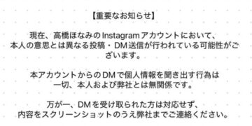 簡單來翻一下意思:經紀公司LIGHT是在聲明中表示,高橋ほなみ(高橋保奈美)的IG帳號有可能會出現非本人的發文及發送私訊(DM),如果該帳號透過私訊詢問個人資訊,那跟經紀公司及高橋本人完全沒關係,請千萬不要回應,並且立刻截圖和事務所聯絡〜