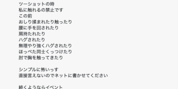 簡單來翻譯一下田野憂寫了什麼:她是呼籲粉絲在合照的時候「別碰我」,因為在之前有人揉她的屁股、從後面揉她的腰、把手搭在她的肩上、強行擁抱她、故意臉貼臉以及用手肘觸碰她的胸部⋯田野憂說,上述的行為真的讓她覺得很可怕,但她沒有辦法當面說出來,只好在社群上發發牢騷: