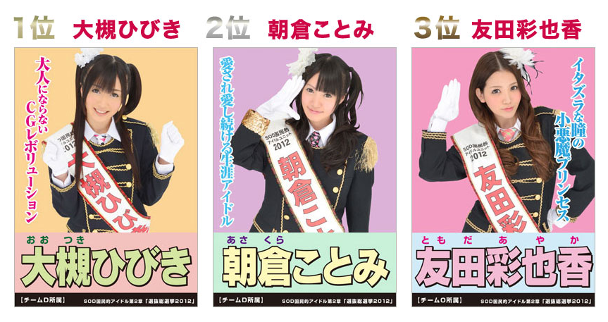 這是SOD集團的大型企劃活動,他們先找來9位女優、將她們妝點成「AKB48」的明星臉後再分成3組進行「SOD国民的アイドル第二章」的票選活動;這除了是滿足日本影迷意淫AKB48的念頭外,由於9位女優分別來自9個不同的經紀公司所以多少也有各勢力暗中較勁的味道,而在今天,SOD公布了第一波的計票結果: