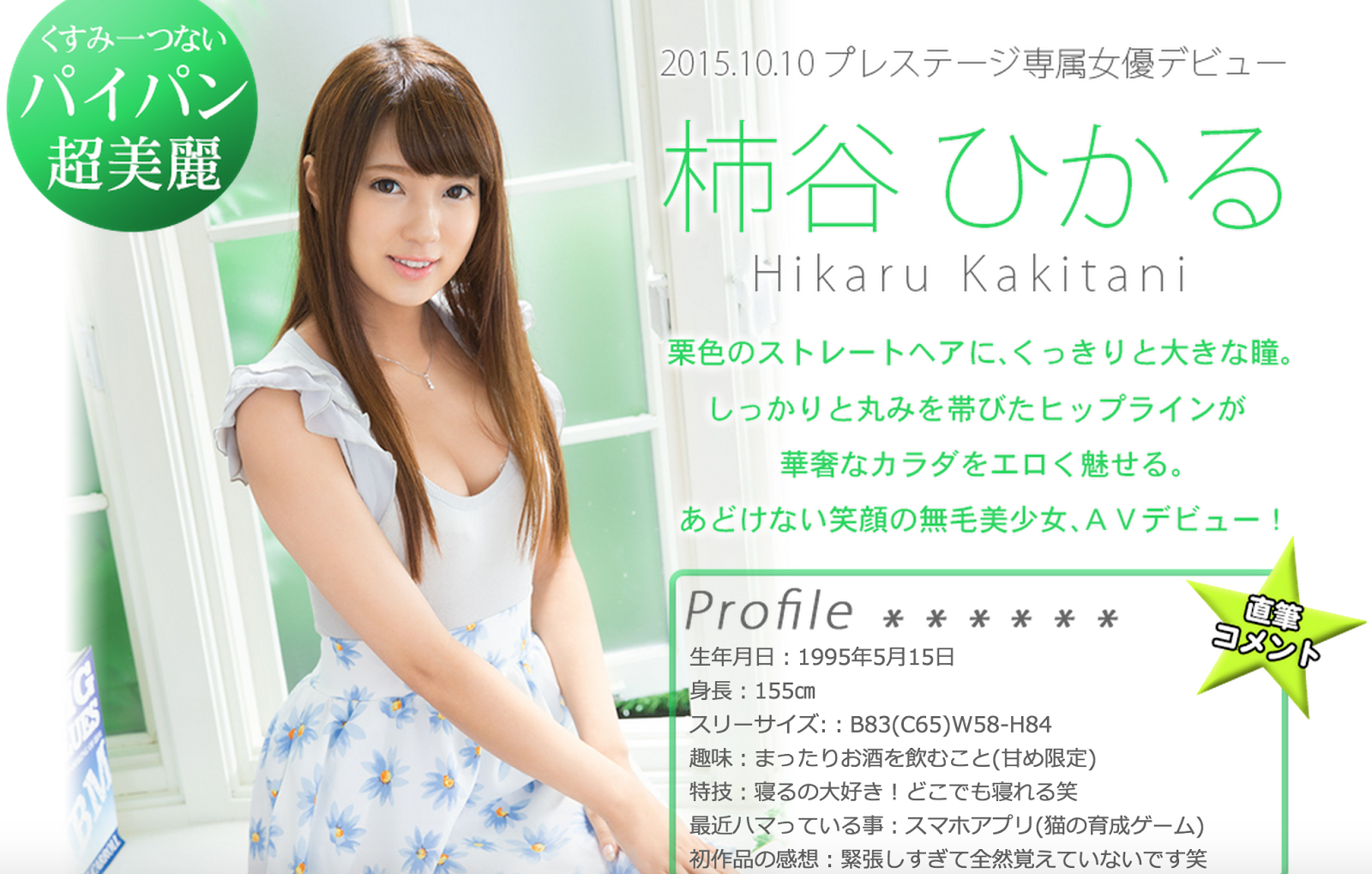 早上介紹的「今井かな(今井佳奈)」是以「アイドルを超越した美少女が1本限りAVデビュー(超越偶像的美少女只限一支的AV出道)」的口號強力促銷,而這篇文章要介紹的「杮谷ひかる(杮谷光)」則是用「くすみ一つないパイパン超美麗(乾淨無瑕的白虎 超美麗)」為宣傳主軸,似乎又是一個不看不行的超級新秀: