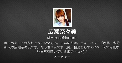 看看這位「広瀬奈々美(廣瀨奈奈美)」在twitter上的自我介紹吧:她是業界知名經紀公司「踢砲瓦死(T-Powers)」的「新人」,初次見面,請大家多多指教~