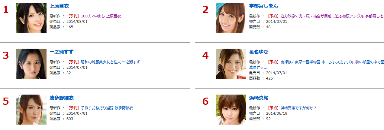 所以就算波多野結衣、一之瀬すず(一之瀨鈴)、浜崎真緒和川菜美鈴像是不要命的發片,但她們仍然不是上原亜衣的對手。因為一樣發片量很大,但很多企劃還真的只有上原亜衣能演,這不但讓她發片量非比尋常地大而且也與其他女優拉開了安全距離。如果你對上述內容不是很了解的話,那就看看上原亜衣為了中出片商「本中」所拍攝的AV Open參賽片「100人x中出し」:
