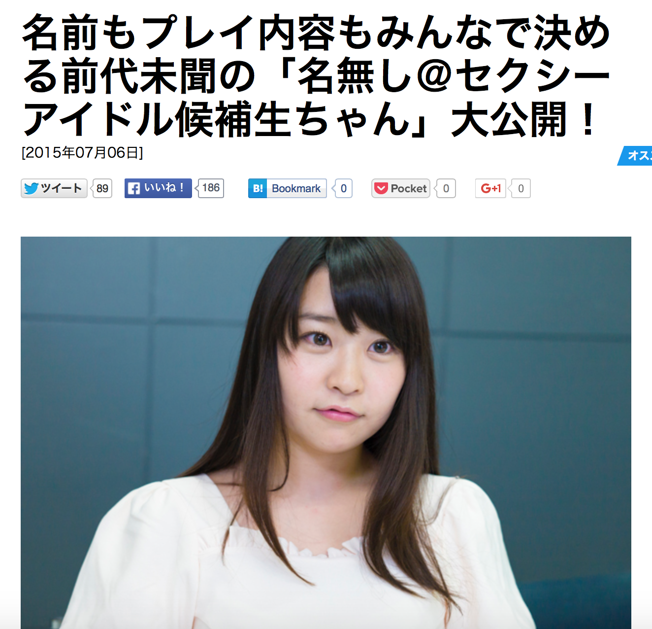 從頭說起吧。這位女優是在7月初的時候於週刊プレイボーイ(週刊PlayBoy)上以「名無し@セクシーアイドル候補生ちゃん(無名@Sexy Idol候補生)」的名字拍攝寫真,當時我們就知道這位女優即將要在Alice Japan出道,但是她沒有藝名片子也還沒有拍,因為她希望能用公開募集意見的方式由Aver們來決定一切,她要拍一支大家想看的AV!