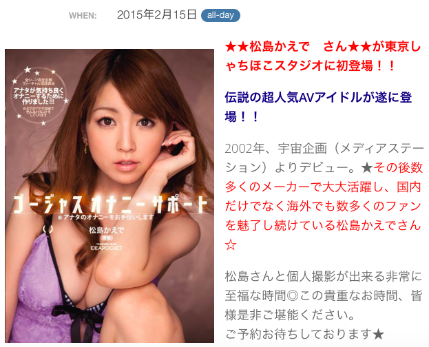 那就是華人圈始終非常關心的「松島かえで(松島楓)」,掌握訊息比較快速的影迷應該都知道她又開攝影會了,時間是在2月15日於「東京しゃちほこスタジオ」的會場,這位女神級的前AV女優會以「泳裝攝影」、「簽名」以及「合照」方式與影迷交流: