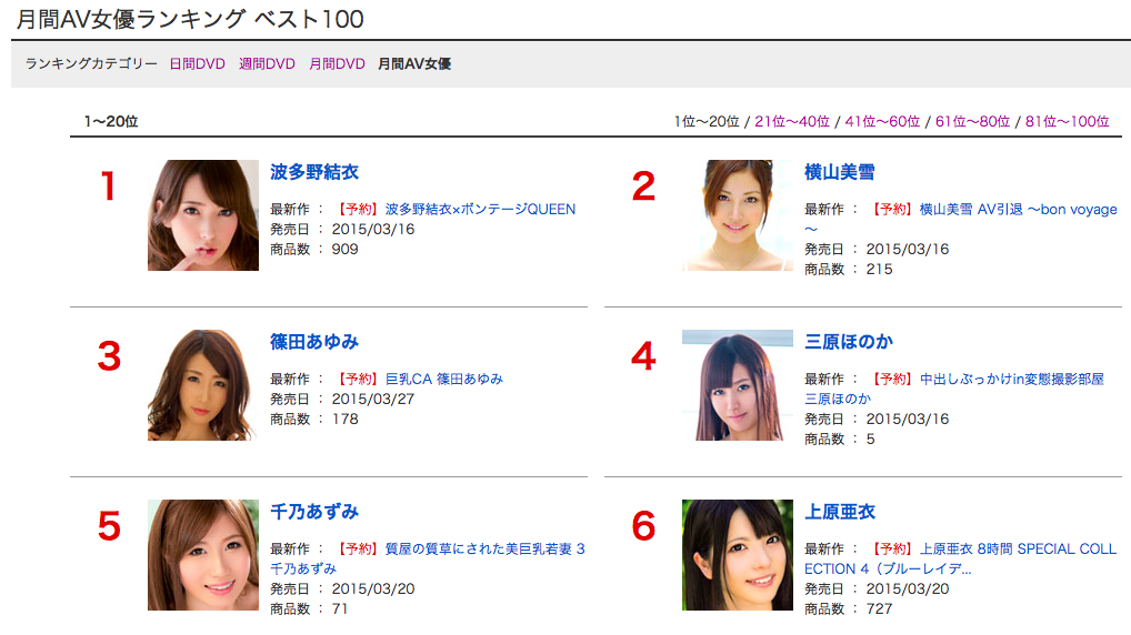 卸下了專屬身分瘋狂發片的她在DMM一月的銷售累積排行是高升到了第5名,這個成績有多屌呢?我們別看在她前面那四位就看看第6名是誰好了,答案是很可能要在後天被カリビアンコム(加勒比)公布下馬的「人気no.1」大物上原亜衣~
