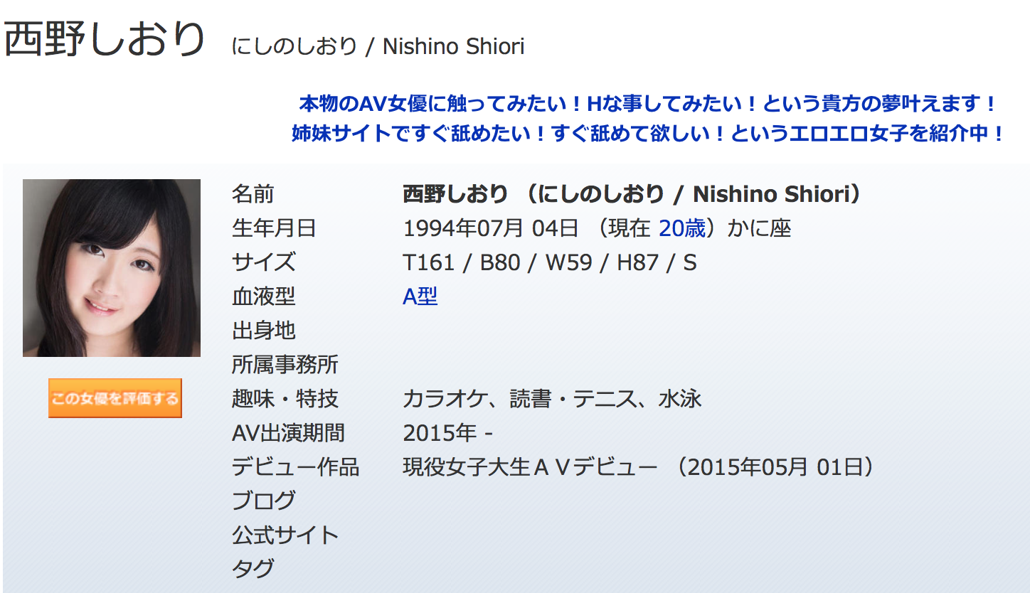 除了完全一模一樣的五官輪廓外大家還可以用「冬川千鶴」與「西野しおり(西野詩織)」的基本資料來進行比對:「死ぬほどワンピが似合う美少女と生中出し性交 」作品封底的左下角公布的基本資料和西野しおり(西野詩織)於h.m.p官網公布的資料都是身高161公分、三圍B80W59H87,我想為什麼會如此「巧合」應該不用我多說了吧?
