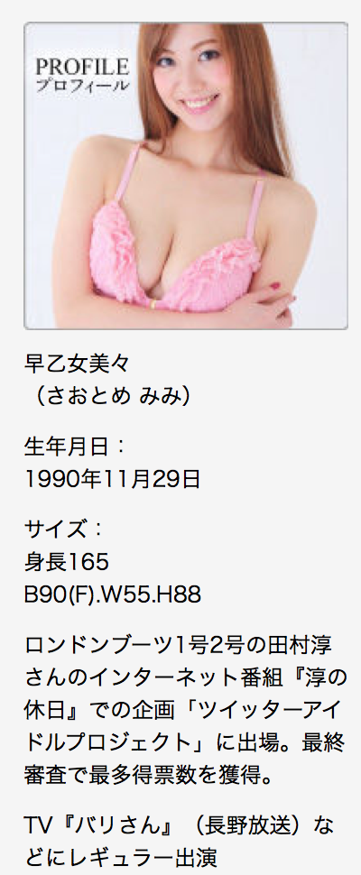 首先,當然就是「自首無罪」,明白告訴大家她真的沒那麼年輕:在Blog上這位女優是告訴大家她是1990年生、今年已經要25足歲了,所以臉蛋偏熟是自然的;但相信大家也看到了,在自我介紹欄中早乙女美々是告訴大家自己不但是個AV女優而且還在網路及電視媒體的節目中有固定演出!