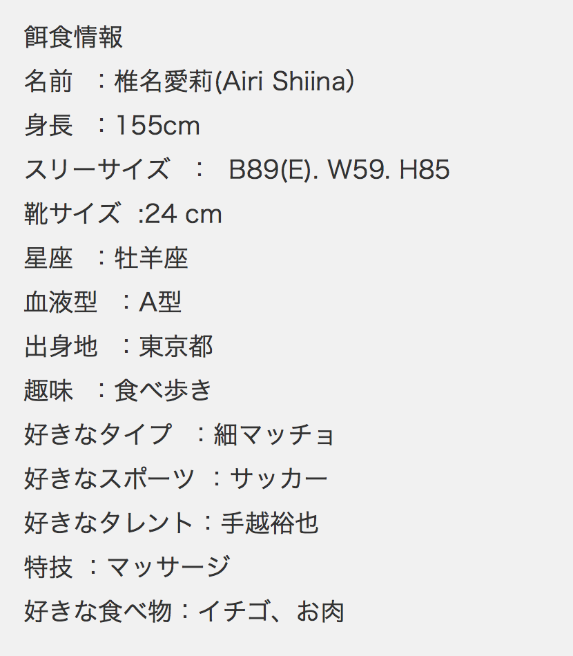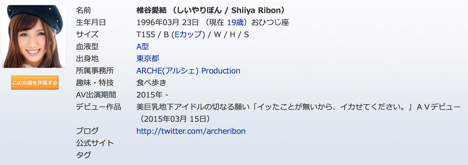 她是當初以「美巨乳地下アイドル(美巨乳地下偶像)」之名在片商「ピーターズMAX(Peter’s Max)」發片的「椎谷愛結」:從基本資料的比對就可以發現除了身高(155公分)及罩杯(E)完全吻合外就連興趣是「食べ歩き(邊走邊吃)」也是一模一樣;再就臉蛋及身材比對,右乳上位置完全相同的「痣」也洩露了她的身份,唯一不一樣的就是她剛出道的時候是個下體無毛的白虎而到了東熱卻是有陰毛的….
